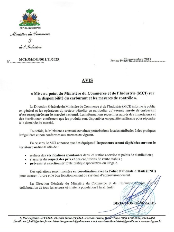 Port-au-Prince – Dans une mise au point rendue publique ce 20 novembre 2025, le ministère du Commerce et de l’Industrie (MCI) a tenu à dissiper les inquiétudes circulant ces derniers jours au sujet d’une prétendue raréfaction du carburant sur le marché national. Selon la Direction générale du MCI, aucune pénurie n’a été enregistrée, et les informations collectées auprès des importateurs et distributeurs confirment une disponibilité jugée suffisante pour répondre à la demande.